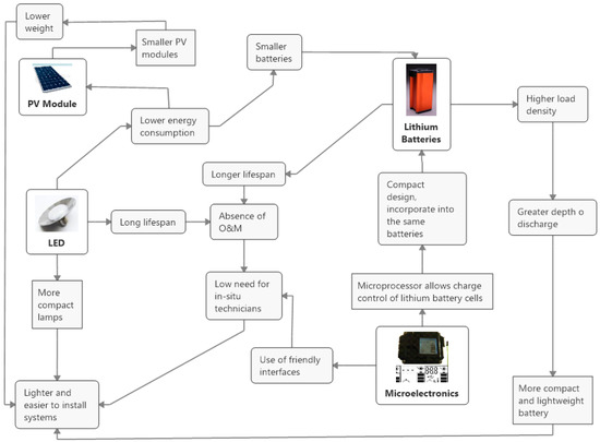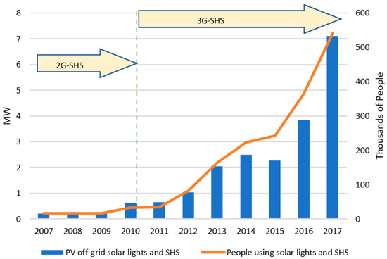 Between 1995 to 2000, an evolution process of PV technology produces a new generation of SHSs perceived. It is the use of equipment, components, and electronics specifically designed to use solar energy. Achieving an optimal use of the energy generated with photovoltaic panels defines this trend, and rural electrification projects incorporate SHSs as a formal alternative [40,79].