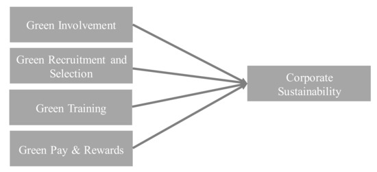 Largely, firms’ operations and corporate sustainability or efforts for adopting it are greatly influenced by humans [7]. Green-oriented management practices are executed entirely by humans expressing a positive attitude towards the environment and having a sense of responsibility for their actions that may have any environmental implications. Green human resource management practices (GHRM) consist of key practices such as green recruitment and selection, green training, pay and rewards, and employees’ involvement. Needless to say, the role of GHRM is very significant when it comes to the development of environment-friendly norms and practices within organizations [8]. The authors argue GHRM practices play a vital role in providing the necessary ingredients for achieving corporate sustainability [9]. As such, recent literature emphasizes the significance and the potential of GHRM in achieving corporate sustainability [8].