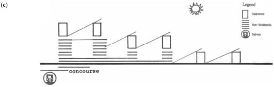 (a) Schematic image of the 1980s Comprehensive Plan for Seoul; (b) prototype of station areas; (c) section diagram of mixed land uses building near the station (source: Sung and Choi, 2017; Kahng, 1980 [26,31]).