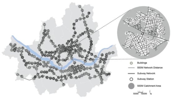 500 m pedestrian walkshed of subway stations (source: drawn by author).
