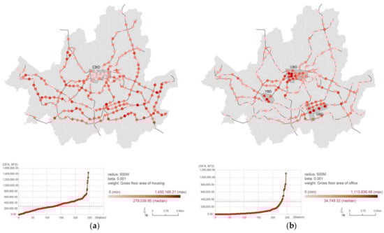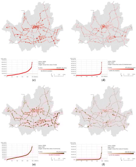 Figure 3a–f illustrates how large areas of building GFAs can be accessible to subway stations (destination) within a 500 m walkshed using the Reach analysis method of UNA—the higher the value of the weights, the more influential the impact on the station area. The darker red stations have more extensive GFA access than the lighter red ones. The unit is square meters. The input setting of the Reach analysis for building GFA within the station catchment areas is: