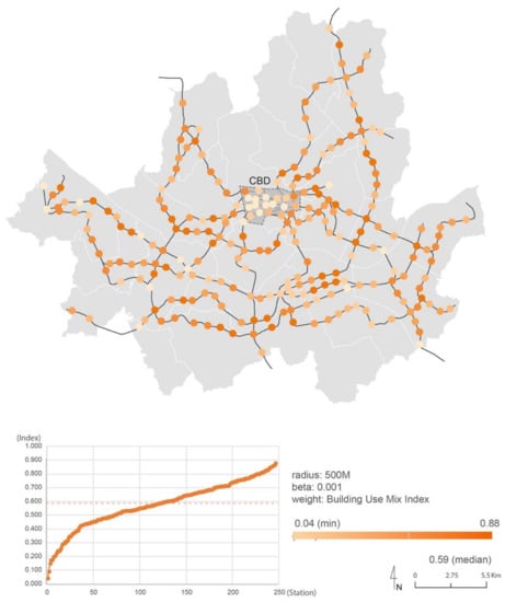 The city-wide building-use balance for the 246 stations’ TOD areas is shown in Table 1. On average, the housing of fifty-two percent, the offices of fifteen percent, the retail of nineteen percent, the entertainment of four percent, the community of six percent, and the industry of three percent occupy the station catchment area in Seoul. is the city-wide average ratio of each building use within a station () area shown in Table 1. The BUI value ranges from 0 to 1, where a value of 1 indicates a perfect match with the city-wide balance. The higher the value, the closer the proportion to the city-wide distribution. Figure 4 illustrates the BUI outcome for each station, where a lighter colors mean a weaker match with the city-wide land-use mix ratio. Most stations with a lighter color located in the CBD area have a different proportion of building mixed-use from the city-wide land use mix balance.