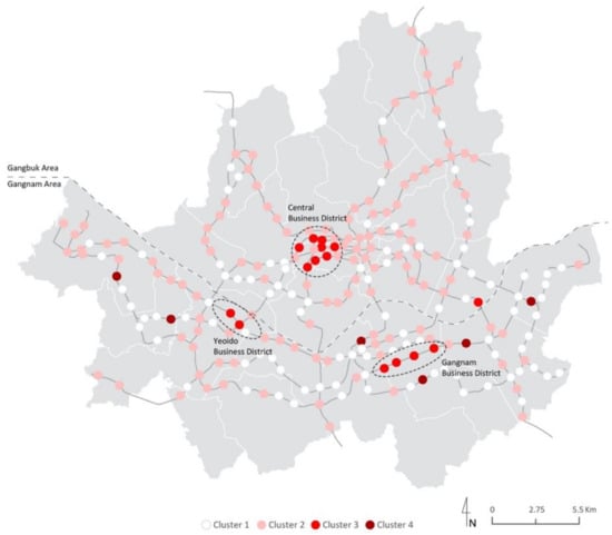 Figure 5 illustrates the cluster membership for each station on a map. There are approximately two times as many Cluster 1 types in the Gangnam area (n = 60) as in the Gangbuk area (n = 36). There are slightly more Cluster 2 types located in the Gangbuk area (n = 77) than in the Gangnam area (n = 52). The Cluster 3 type is collectively found in the business district areas of Seoul. All Cluster 4 types are only located in the Gangnam area.