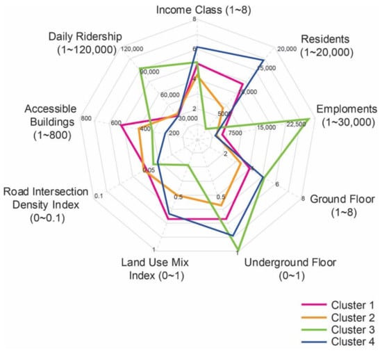 The radar chart (Figure 6) displays the clustering results comparing the quantitative variables of averages on axes starting from the same central point. This uncovers patterns across multiple values to identify dissimilarities of clusters. The chart helps to understand how the values of demographics, built environments, and travel behavior characteristics are different between cluster types through monitoring patterns. The four clusters are also ranked based on nine parameters on the chart. The color coding for each cluster helps to visually correlate and contrast the clusters regarding its diverse aspects. The chart gives an indication that Cluster 1 has higher ranks for accessible buildings and the land use index in comparison to other cluster types. Cluster 2 displays globally lower ranks for parameters than other clusters, except for the road degree index and daily ridership. Cluster 3 has the highest ranks for employment, ground floor, underground floor, and daily ridership, but shows lower ranks for residents and the land use mix index. Cluster 4 shows higher ranks for income class and residents, but lower ranks for employment, the road intersection density index, and daily ridership.