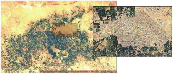 The study is conducted in Tolga city (34°43′00″ N and 5°23′00″ E), in Biskra region [42], and 363 km the south-east of the capital Algiers (Figure 2); it represents the most significant Tolga Oasis Complex territory in Algeria [43]. The Oasis Complex is composed of 6 oases cities polarized by Tolga city, which presents the biggest urban area of the Oasis Complex. The study area has a hot arid climate (Köppen-Geiger BWh) with a variation between summer and winter temperatures. Since 1995, Tolga Oasis Complex has registered significantly less rainfall quantity with a yearly average of 126 mm (Figure 3). According to the meteorological station WMO 605265, the heating degree days estimated during the last five years (2016–2020) were 293 HDD. However the cooling degree days were greater with 1113 CDD. Otherwise, the highest temperature registered during the last decade is 46 °C in July, when the lowest is 3.0 °C in January [5]. These last weather data indicate the climactic nature of the territory, which is hot and arid. Furthermore, Tolga Oasis Complex’s population reached 150,036 in 2017, where 50% of the total population is concentrated in the Tolga city area. Since 1987, Tolga city demography has been growing five times more than the surrounding cities’ communes, reflecting the attractiveness of the living facilities provided in the city. Additionally, the Oasis Complex’s urban landscape shows a strong integration into the rural world and the urban area’s attachment to the Palm Grove [44]. Overall, Tolga Oasis Complex (Appendix A) is surrounded by 1,006,600 palm trees, “Phoenix Dactylifera” where 31% of them are situated in Tolga city land’s limit.