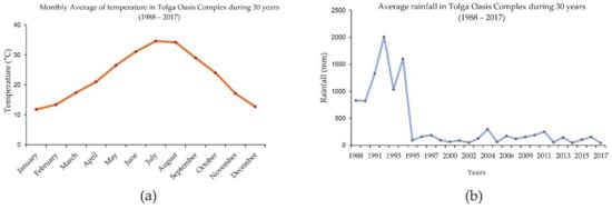 Temperature and rainfall averages for 30 years (1988–2017) in Tolga Oasis Complex: (a) Monthly averages of temperature for 30 years; (b) Annual rainfall averages during 30 years.