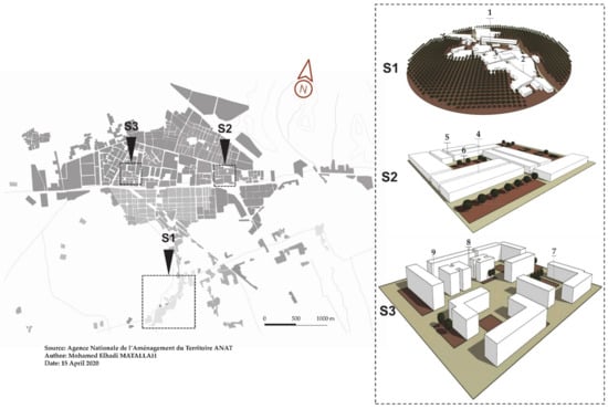 In this research, three urban fabrics are selected to be assessed in terms of outdoor thermal comfort in Algeria’s dry climate. The investigated urban fabrics are chosen from Tolga Oasis Settlements and represent three different typologies of housing: Old neighborhood (S1), Individual Housing neighborhood (S2), and Multifamily Housing neighborhood (S3) (Figure 4). We named the selected neighborhoods by sites (S) to describe the three numerical models in the second methodology step. The selection criteria were explicitly based on: (i) age of the urban fabric “built-up history”, (ii) urban fabric typology, and (iii) urban geometry characteristics (Table 1).