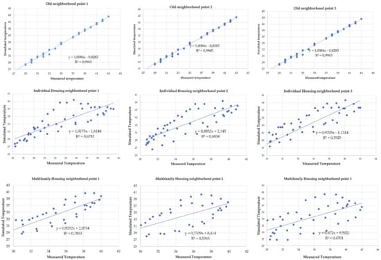 The accuracy of the ENVI-met model simulation was validated through a comparison between the measured and simulated data. This step focused on how close the simulated data are to the measured data. The validation is an essential step to create a reliable numerical model. To validate the neighborhood’s models, we followed ASHRAE 14 guidelines, using two indices: (1) mean bias error (MBE) and (2) root-mean-square error (RMSE) [47]. The MBE is a nondimensional measure of the overall bias error between the measured and simulated data with a known time resolution. The (RMSE) indicates how well the simulation model describes the variability in the measured data [53]. Moreover, for the validation step, simulation was run for 48 h because we considered this a sufficient duration for the model’s validation (Figure 5) and (Table 4).