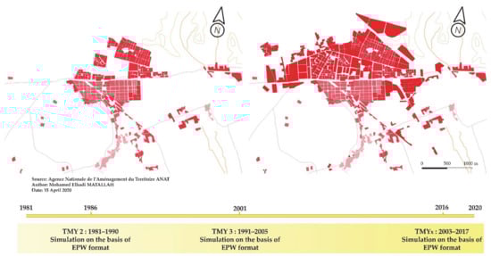 We simulate the three models based on the Typical Meteorological Year (TMY) files with Epw format: TMY2 (1981–1990), TMY3 (1991–2005) taken from Meteonorm 7.2 database (https://meteonorm.com/en/ accessed on 20 August 2020) [55], and TMYx (2003–2017) (Figure 6). The last meteorological file is taken from http://climate.onebuilding.org/ (accessed on 20 August 2020) [56], which is validated by the study of Semahi et al. [53] and shows a high-quality.