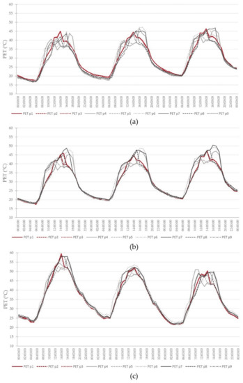 As explained, the three models were simulated for three consecutive days during (15th, 16th, and 17th) July in three different periods: TMY2 (1986), TMY3 (2001), and TMYx (2016). In this section, all PET maximums, minimums, and averages are reported through the total values of PET [48]; otherwise, only the 15th July is demonstrated in the summary of the results.
