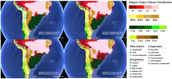 Observed and project climate shifts 1901–2100 depicted by the world maps of the Köppen climate classification for Brazil, created by the authors using A1F1 scenario by IPCC, obtained from Rubel and Kottek [22,23].