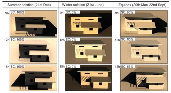 The Alvorada House passive design strategies consisted of the appropriate position of the fenestrations, ventilation, and shading strategies. Windows were placed predominantly facing north (58.5%), at different levels to allow stack ventilation. No fenestrations were considered facing south to decrease heat losses in winter; the remaining windows were considered facing east and west, allowing cross ventilation in summer (prevailing direction of cool summer winds). Shading was ensured in the summertime through the approximately 60 cm eave on the north façade (Figure 5), and through foldable shutters on the east façade. On the west façade, the fenestration was supposed to be covered up by an external structure with deciduous vegetation but in itself was not successfully able to deliver the intended shading, and thus, not considered in this analysis (decreasing its potential performance). Roof was designed to be ventilated in summer. Its ventilation system comprised two apertures in the north and south façades that should be kept opened in summer to force the fresh air to pass through the roof structure. It was kept closed for simulation and comparison purposes.