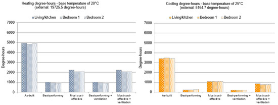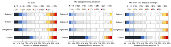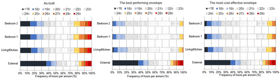 Frequency of temperatures for a year-period was shown for as-built and optimised building envelope scenarios (Table 5 and Figure 6). In these figures, the frequency of temperatures within the narrow thermal interval of 20–25 °C was coloured in white. The frequency of temperatures below the lower thermal comfort interval was marked in blue to represent a gradual increase in thermal discomfort due to cold as the temperature decreases. Temperatures above the upper thermal comfort interval were marked varying from yellow to red to demonstrate the intensity of the thermal discomfort as the temperature increases. The outdoor conditions were within the thermal comfort for nearly 31%, 52%, and 57% for the narrow (20–25 °C), wide (18–27 °C) and extended (18–29 °C) thermal comfort criteria, respectively.