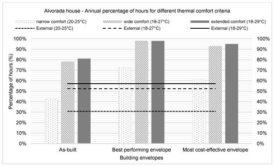 Adopting the most cost-effective scenario, the MCMV house would have the indoor conditions equivalent to 63%, 95% and 96% of the time within the thermal comfort criteria of 20–25, 18–27, and 18–29 °C, respectively. Based on the same envelope, the Alvorada House would achieve similar levels equivalent to 61%, 93% and 95% of the time within the thermal comfort criteria, respectively. The difference in the results between the two case studies is mostly attributed to the more spread-out form of the Alvorada House in comparison to the MCMV house. Annual percentages of thermal comfort are summarised comparatively in Figure 7, Figure 8 and Figure 9.