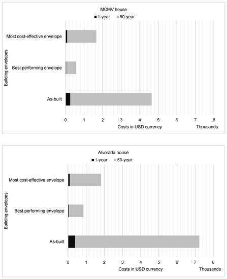 Running costs assessment highlighted the importance of the exposed envelope surfaces to the environment even in buildings of the same typology, similar areas and using the same envelope components. Alvorada house had running costs 56%, 49% and 10% higher than the MCMV house for standard, best performing and most cost-effective envelopes, respectively, which were mostly attributed to its geometry and shape.