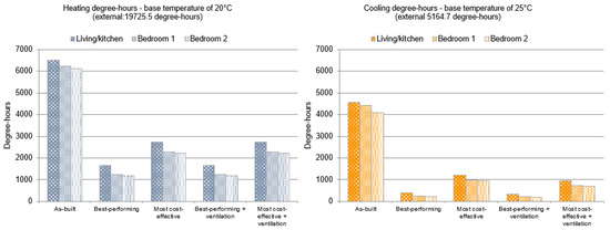 The thermal comfort criteria used to analyse the results considered adaptive comfort models such as demonstrated in [51,52,53,54,55,56] as well as well-established practices in Brazilian thermal comfort research [57], which presupposes that people have a higher degree of acceptability with the indoor temperatures mainly when associated to naturally ventilated buildings. Acceptable comfort limits were calculated using 80% of acceptability according to adaptive ANSI/ASHRAE Standard 55 [53], which were found to be within the temperatures of approximately 18–29 °C, due to the seasonal characteristic of the climate. This comfort interval of 18–29 °C was used to calculate cooling and heating demands in Table 4. However, research also demonstrated that for the same climatic zone of Porto Alegre, people in sedentary activity and naturally ventilated environment preferred temperatures varying from nearly 20 °C to 25 °C [58]. In order to facilitate the analysis, accounting for different levels of acceptability to the occupants, three different comfort criteria were considered: narrow (20–25 °C), wide (18–27 °C), and extended (18–29 °C) comfort intervals. Selective ventilation was considered in a way that when the outdoor conditions were unfavourable, the windows were closed to avoid heat or cold coming inside the building. This aims to represent the ability of the occupants to actively act to restore their thermal comfort within their environment (e.g., open/close window; cold/warm drink; add/remove a clothing layer), while keeping the temperatures within the acceptable comfort criteria.