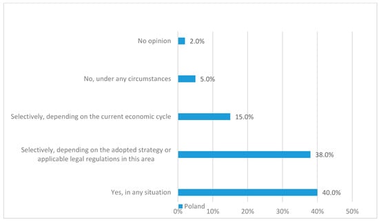 It was crucial for the authors of the study to find the opinions of managers from Poland on whether it is important to follow the principles of sustainable development in business activities. It often happens, after all, that seemingly generally accepted codes or standards are not followed at the level of individual entities. Less than half of the surveyed managers (40%) in Poland confirmed the need to consider the principles of sustainable development in their business activities in every situation (Figure 1). However, this coefficient may indicate either a lack of education in this area or a certain opportunism of Polish managers regarding these rigid rules. This is confirmed by 38% of indications regarding the conditions in which such rules should be used in the companies (see Figure 1). Only 15% of Polish managers are determined to selectively follow such rules, making it dependent on the current economic cycle. This shows a strong attachment of some managers to achieving the basic goal in the short term, which is profit, and only in the longer term to consider other factors, even those seemingly obvious and serving the general good of society. A small group of Polish managers (5%) stated that their business activities did not comply with the principles of sustainable development. It is worth trying to reach this group and educate it on the positive aspects of sustainable development.