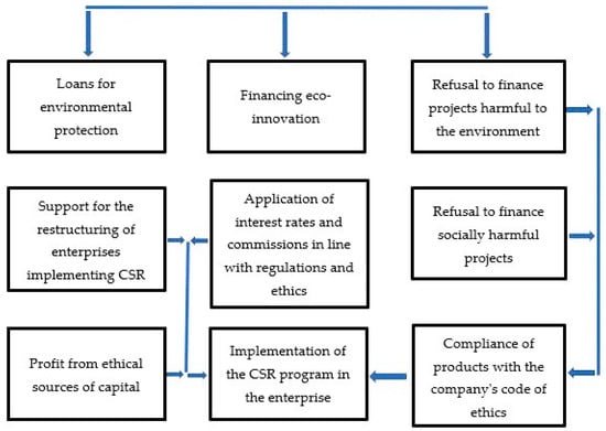 In the literature on the subject, the authors often indicate that corporate social responsibility is currently equated with the sustainable development of enterprises and the circular economy [1,2,3]. There are also various ways and models of CSR implementation in different countries, such as the Nordic model [4,5,6,7]. In some scientific publications, the authors also mention socially responsible investments [8,9,10]. Banks, as key players in the financial market, implemented CSR procedures long ago [11,12,13]. The activities of banks, especially in new areas (such as those related to sustainable development), are also exposed to additional risk [14,15].