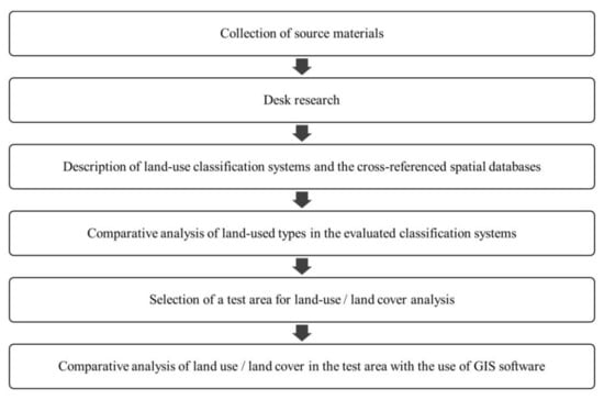 The study involved desk research and a comparative analysis of the collected source materials with the use of cartographic methods. Source materials were collected in the first stage of the research. The existing land use classification systems were analyzed in the context of formal classification systems that are regulated by legal provisions and are based on cadastral data, CORINE Land Cover data, or Urban Atlas data, as well as informal classification systems that are created based on research results or the existing classification systems and are used for specific analytical needs [42,44,45,46].