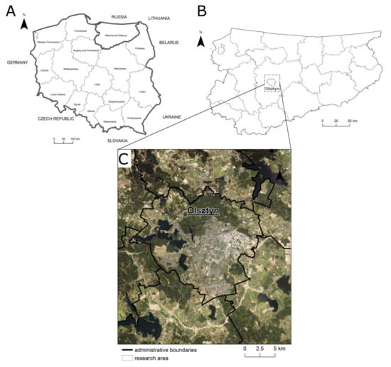 The studied area was the city of Olsztyn and the surrounding suburban zones. Olsztyn is situated in the Polish Voivodeship of Warmia and Mazury (Figure 2), and it had a population of 171,979 in 2019 [47]. Olsztyn was selected for the study because it is a voivodeship capital and a functional urban area (FUA). Olsztyn is an urban center at the domestic level, and it fulfills selected metropolitan functions at the domestic and international level. The studied area features diverse land use categories and typologically different zones, including urban areas (with high development density), suburban/transitional areas (peripheral areas with lower development density, and the coexistence of highly developed and undeveloped land), and rural areas with a predominance of undeveloped land and natural land cover.