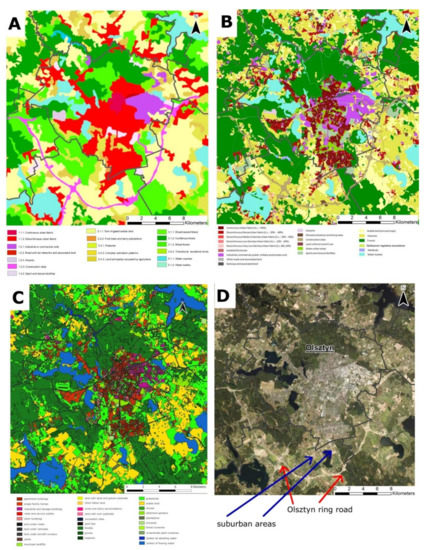 Land use classification systems that are directly linked with spatial databases appear to be best suited for analyses of land use/land cover. Therefore, the applicability of classification systems for land-use analysis was assessed in systems that are cross referenced with the following spatial datasets: CORINE Land Cover, Urban Atlas and the Database of Topographic Objects. The quality, validity, and availability of data; the number of identified land-use types in the studied area; and the degree of data generalization were evaluated in each system. The differences and similarities among the compared databases were determined for the example of Olsztyn city and the surrounding suburban zones (Figure 3). Additionally, two areas were indicated where differences among the analyzed data sources were visible (the Olsztyn ring road and a fragment of the suburban area). The city of Olsztyn was selected for the study because the most rapid changes in land-use structure take place in urbanized areas and areas subjected to anthropogenic pressure. These areas are also characterized by considerable diversity of land-use/land-cover types and a high number of land-use types, which make them ideally suited for the needs of this study. Land-use/land-cover maps were compared with an orthophoto map of the test area.
