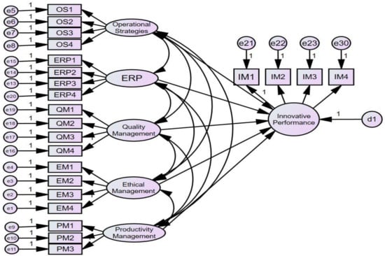 As previously mentioned, the purpose of this study was to determine the empirical effects of smart factory operation strategies and system management on the innovation performance of SMEs based on constructs from previous studies. The independent variables are the ERP, quality management, ethical management, and productivity management systems, which are also components of the smart factory operation strategy and system management, while the dependent variable is represented by innovation performance. These variables were analyzed using a structural equation model using the AMOS program, as per Figure 1.