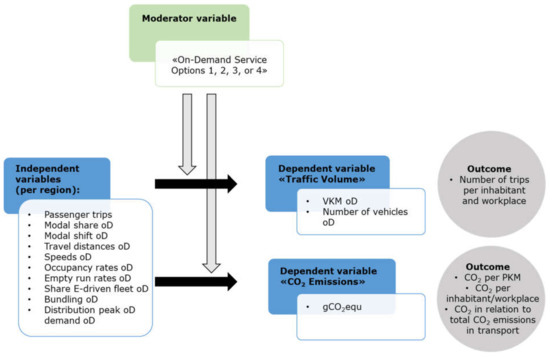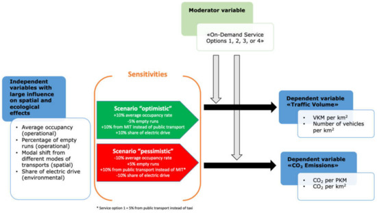 To calculate the effects of on-demand collective transport services on the sustainability dimension, the following additional operational assumptions were adapted from [40] who refer to other studies, e.g., [13,50] as well as data from the Federal Statistical Office and the Federal Office for Spatial Development: