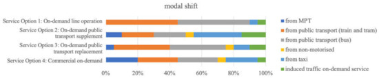 - Modal shift: the modal shift describes the percentage of new journeys generated by an on-demand collective transport service that substitute other modes of transport. If an on-demand service option attracts passengers from less sustainable transport, the effect on sustainability is more positive than if the customers come from, for example, non-motorised transport. If public transport is completely replaced, it is assumed in a simplified way that all public transport journeys switch to the on-demand services. A factor for induced trips was derived from the findings from domestic and international on-demand (collective) transport services e.g., [53,54]. The modal shift was based on the following assumptions as shown in Figure 2. First, it was assumed that in Service Option 1, hardly any trips could be gained from motorised private transport (MPT), because it does not offer door-to-door operations. Instead, around 90% of the generated trips in Service Option 1 stem from passengers that switch from public transport (train, tram, bus) to this new on-demand mobility service. Second, for Service Option 2, the modal shift was based on existing studies from abroad, e.g., [54,55,56,57]. A considerable proportion of the trips that supplement public transport are likely to come from taxis since on-demand driving services offer a cost-effective alternative. Although on-demand services in this option supplement public transport, the cannibalisation of public transport is apparent, but lowest for Service Option 2 compared to all other options. Third, in Service Option 3, the majority of the generated trips (around 60%) are former public transport trips since the conventional public transport service is replaced. An increase in attractiveness is created by the door-to-door connection, which is why former car and taxi rides are also substituted. Fourth, Service Option 4 is a commercial offer, which deliberately seeks to attract MPT drivers as well. The share of people switching from MPT to Service Option 4 is the highest in comparison of all options. The share of people stemming from MPT, train and tram, bus, as well as taxi, is roughly balanced. The modal shift corresponds to studies from Switzerland and abroad e.g., [54,55,56,57]. Fifth, the modal shift was not differentiated by spatial context due to a lack of data. To calculate the sustainable effects of on-demand collective transport services, the following modal shifts (shown in Figure 2) as explained above were made.