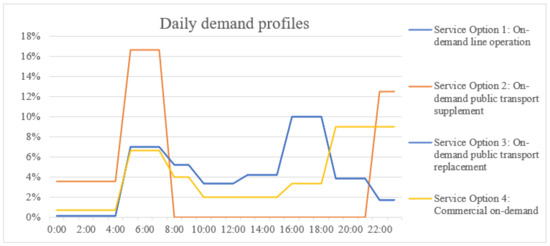 - Daily demand profile: depending on the service option, different assumptions were made for the daily flow of traffic. First, if on-demand collective transport services replace public transport, a typical public transport daily flow of traffic, according to the mobility survey (Mobility and Transport Microcensus) conducted every five years by the Swiss Federal Statistical Office see [59], was used (Service Options 1 and 3). Second, if on-demand services are only offered during off-peak hours, the daily flow of traffic was adjusted to off-peak hours. Third, investigations of on-demand collective transport services in Switzerland and abroad show an atypical course of daily walking compared to other means of transport, e.g., [27], but only if they are used commercially in competition with a public transport offer (see Service Option 4). The daily demand profile (as shown in Figure 3) influences the number of vehicles required and thus the volume of traffic during peak hours.