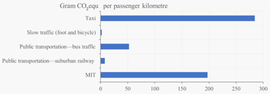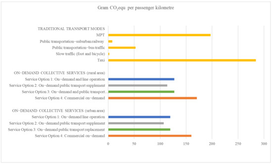 4 In all service options, 500 m was added for the door-to-door connection. 5 Average distance based on possible travel routes in the study area. 6 Average distance for trips using local public transport, according to [58]. 7 Average distance for trips using MPT, according to [58]. 8 Average distance for trips in taxis, according to [58].