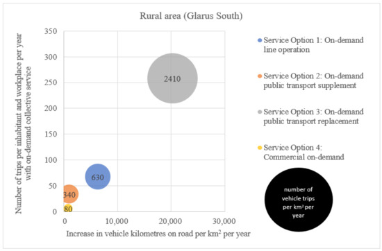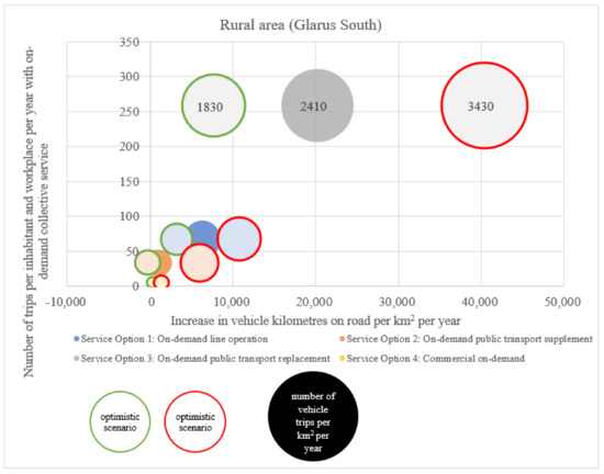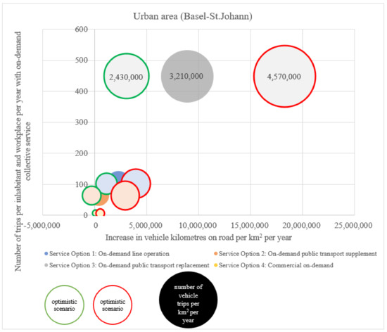 The following two figures (Figure 5 and Figure 6) show the additional vehicle kilometres generated on the road (x-axis) and the number of trips per inhabitant and workplace per year (y-axis) by using on-demand collective transport services. The increase in vehicle kilometres on the road results from the generated vehicle kilometres driven with the new on-demand collective transport services minus the vehicle kilometres omitted for MPT, taxis and public transport. The size of the circle simulates the number of vehicle trips per km2 per year for a rural area (Glarus South) and an urban area (Basel-St. Johann). In particular, the traffic volume in Service Option 3 (replacement of public transport) in both areas is many times higher than in the other service options, where a comparatively manageable additional traffic volume is generated.