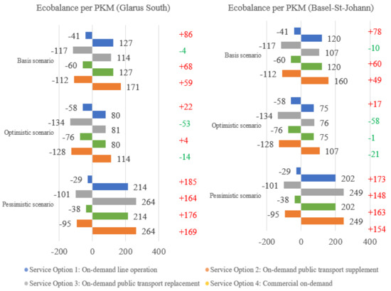 - Assumptions for on-demand collective services: since no values are stored in the mobitool for on-demand collective driving services, it was assumed that the driving services in Service Options 2 and 4 (standard vehicles) consume the same amount of energy per vehicle kilometre as a private car. For Service Options 1 and 3 (both eight-seater vans) a 50% and 20%, respectively, higher consumption per vehicle kilometre was used, based on the stored vehicle sizes in mobitool. Furthermore, it was assumed that on-demand vehicles included a higher proportion of electric vehicles (25%) and that the average use, at least in Service Options 1–3, is higher than that of a car with 1.6 passengers. Emissions per PKM are negatively influenced by the additional empty kilometres. To calculate CO2 emissions of electric vehicles, the current Swiss electricity mix was used [60].
