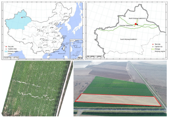 The experiment area is located in Changji City, Xinjiang Uygur Autonomous region, as shown in Figure 1, in the middle of the northern slope of Tianshan Mountain and on the southern margin of Junggar Basin. The experimental site was Xiabahu Farm in Changji City, which is located in the westerly belt of middle latitudes. It has typical continental climate characteristics, such as cold and long winters, hot summers, low precipitation, strong evaporation, and annual and diurnal range of air temperature. In addition, the annual average temperature is 6.8 °C, the extreme maximum temperature is 42.0 °C, and the extreme minimum temperature is −38.2 °C. Moreover, the annual average precipitation is 180.1 mm, and the evaporation is 2390 mm.