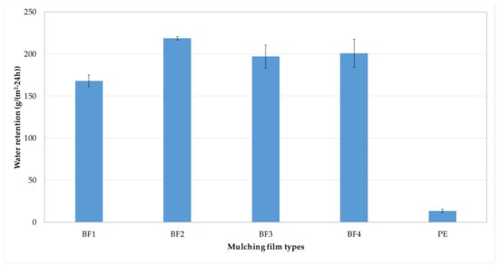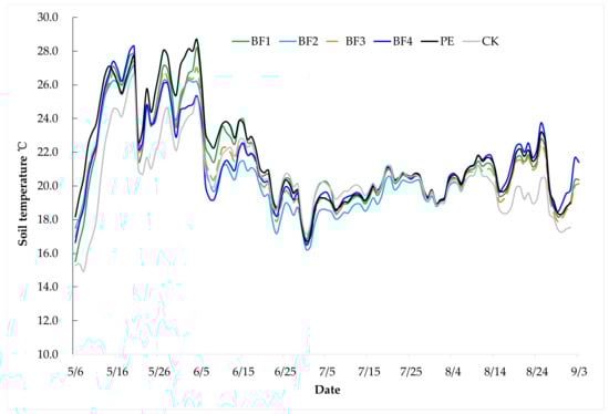 Moisture retention is recognized to be another important function of plastic-film mulching. How to reduce soil water loss after plastic-film mulching is an important aspect to consider when improving the formula of biodegradable film due to the raw material differences compared with PE film. In Figure 3, the moisture permeability data showed that the water content reduction rate of biodegradable film was significantly higher than that of PE film. The moisture permeability of biodegradable film of BF1, BF3, and BF4 was about 190 g/(m2·24 h) when the biodegradable film was kept intact, whereas that of BF2 was about 210 g/(m2·24 h). According to the national standard of biodegradable film GB/T35795–2017, the moisture permeability of biodegradable film with a thickness of less than 10 μm is less than 800 g/(m2·24 h). In this experiment, the moisture permeability of biodegradable film was much lower than this standard. It indicates that the water-retention performance of biodegradable film in China has been greatly improved. In addition, there was no difference in the water retention of different biodegradable films in the production of processed tomato because the technology of drip irrigation under plastic film was used, which better ensures the water supply needed for growth and development. However, attention should be paid to this challenge of meeting adequate water supply in dry farming areas.