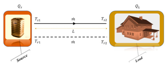 In this Figure, the upper pipeline transfers the heated water from the source to the heat load. After wasting the heated water in the path of passing and crossing the thermal load and supplying it with a certain and constant temperature (assumption of this article), it leaves the heat load and returns to the source. In this case, the amount of heat sent by the source is obtained from the following equation.