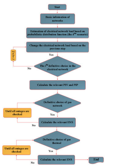 The proposed method solves the problem sequentially. It should be noted that the solutions of load flow of the electrical network are derived using the NR method, while the natural gas and district heating networks are solved only by calculating the ENS values. The flowchart of the proposed model is presented as depicted in Figure 2.
