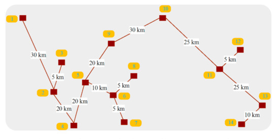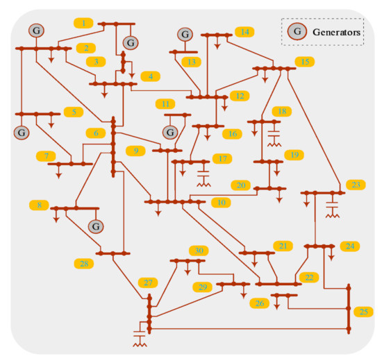 The security studies of the MCESs are carried out in the MATLAB software. Firstly, the experiments are performed in an IEEE-14 bus electrical network, which has been frequently studied in the literature [42]. In order to generalize the proposed method and use multiple networks in the simulation, in addition to the first case test, 30 electric bus networks were analyzed [34,43]. Figure 3, Figure 4, Figure 5 and Figure 6 illustrate a multi-carrier system, including an IEEE 14-bus electrical network, IEEE 30-bus electrical network, 20-node Belgian natural gas network, and 14-node district heating network. In addition, the required data are listed in Table 2. The definitions of system parameters and abbreviations are presented in nomenclature section. Connections between different devices under the networks are based on Table 3. Further details and the required data of these networks associated with each test-system are provided in [18,34,44,45].