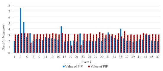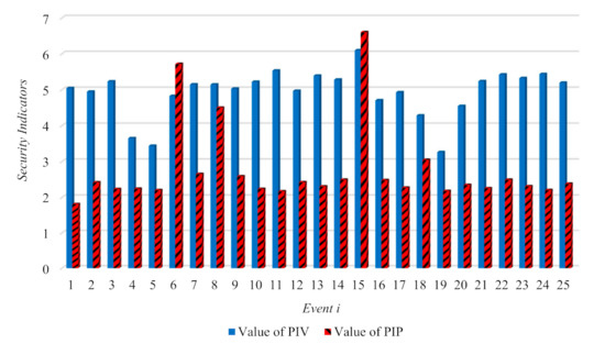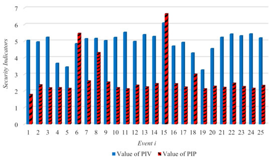 The values obtained for security indicators in the electrical network are given in Figure 7. In Figure 7, the first five events are related to the outage of generator and condenser units, while another 20 events are obtained from the outage of the lines. The values obtained in the bar charts are indicators for PIV and the PIP through the lines. When these values are larger, the outage conditions of the unit or the corresponding line becomes more sensitive. Based on the results, the highest values for the indicators introduced occurred at the outage of line 10, where this line is between buses 5 and 6. According to Figure 7, the outage of the above line creates a significant effect on the network, which is also confirmed by the obtained indicators.