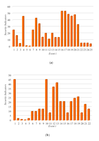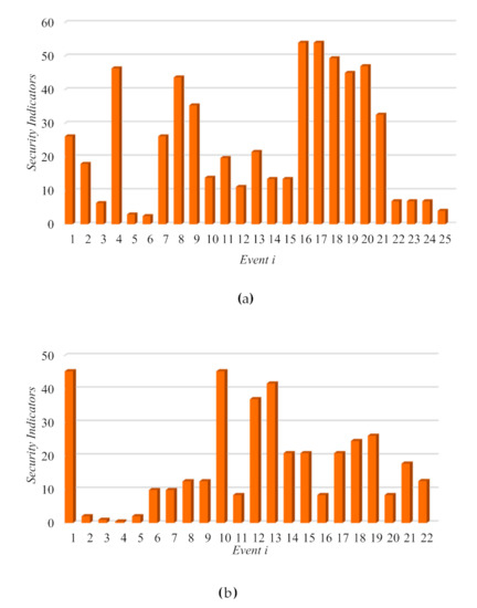 The curves of ENS corresponding to the natural gas and thermal networks are illustrated in Figure 8a,b, respectively. In Figure 8, the values of the first events are related to the output of the units and the output of the lines is given after that. For example, in the ENS of the natural gas network, the first six events are related to the outage of gas tanks, while the next 19 numbers are related to the outage of lines. The highest value obtained for the gas network is related to the outage of lines 10 and 11, which led to the value of 54.0026 for the security index. In the district heating network, the first nine values are related to the outage of heat production units, and the next 13 numbers are for the outage of lines. In the thermal network, the highest value obtained for ENS is related to the slack boiler, which is equal to 45.3125. In other words, the outage of the slack boiler has led to the highest ENS value.