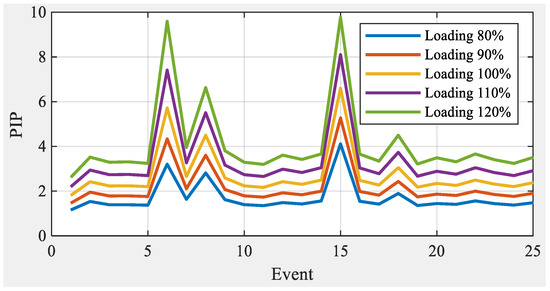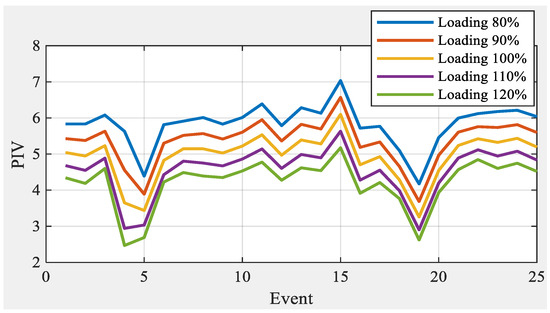 One of the standard tools for evaluating the performance of integrated systems is sensitivity analysis. In this section, the sensitivity of security indicators to the amount of electrical network load is examined. Therefore, in Figure 9 and Figure 10, the sensitivity of security indicators (PIV and PIP) from 80 to 120% loading is plotted.