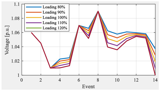 By comparing Figure 11 and Figure 12, it can be observed that, for example, 80% load has the highest PIP value and the lowest PIV value, while for 120% loading, the opposite happened. In terms of voltage profile, the voltage sensitivity of electrical network buses can also be obtained by the amount of load, where this problem is illustrated in Figure 11.