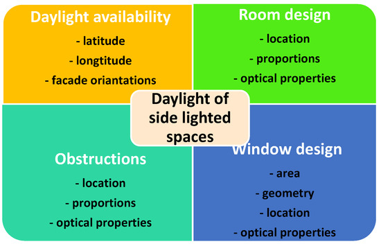 Parameters influencing the daylight of side-lighted spaces (according to [29]).