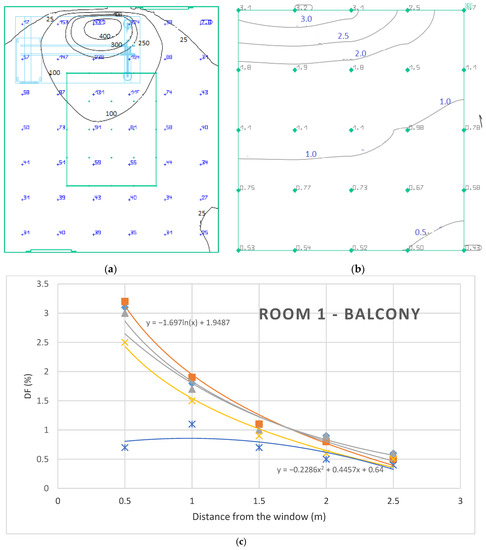 Results of (a) illuminance (lx) and (b) daylight factor (%), Room 1—with balcony; and (c) the decrease of the DF at points remote from the transparent structure.