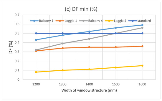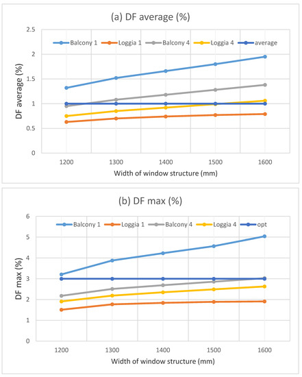 The effect of the change of glazed surfaces on the resulting DF in the observed rooms is interesting in that this effect is different for balconies and loggias. In rooms with balconies, DFmin, DFmax, and DFaverage also increase by increasing the window area. In loggia rooms, these values are almost parallel lines (see Figure 15), indicating that these resulting values of DFmin, DFmax, and DFaverage vary very little.