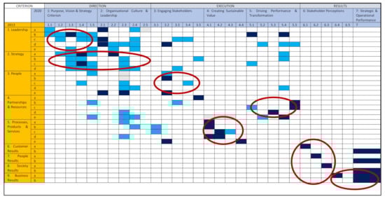 The EFQM 2013 and 2020 models’ criteria and sub-criteria were compared based on the keywords and criterion description. Additionally, since specific guidance points support both EFQM models’ sub-criteria, a similar analysis was made between guidance points for 2013 (total of 119 guidance points) and 2020 (total of 112 guidance points) models. The analysis results are presented in Table 1 and Figure 4 (see Table 2 for Figure 3 legend). The results highlight that Leadership, Strategy, Product Process and Services, and Business Results are the EFQM 2013 model criteria that more strongly influence the EFQM 2020 model. Conversely, the criteria from the EFQM 2020 model that have a stronger adoption of guidance points from the EFQM 2013 model are Purpose, Vision & Strategy, and Organisational Culture and Leadership.