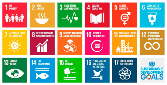 Since the 1980s, we have been faced with the challenge of generating a collective responsibility that allows us to face the problems that humanity confronts and that seriously threaten its future [16]. Today, the need to promote sustainable development is even greater, and it is understood as a crucial challenge that should foster practical actions so that we can all build a better future together, one that allows ending poverty, inequalities, achieving peace and justice and protecting human rights and the planet [17]. In this sense, the UN recognizes three major dimensions of action: economic, social and environmental, from which 17 SDGs are suggested (Figure 1):