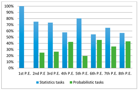 There were analyzed 283 mathematical tasks (Figure 3). Of these, 65.4% correspond to tasks related to statistics issues and 34.6% to probability. To establish this classification, the lesson topic declared in the pages of the textbook was considered.