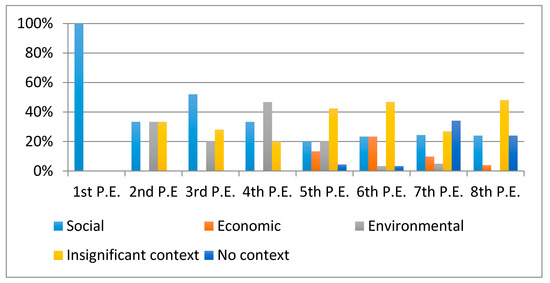 If we focus on how these contexts are distributed in the different educational levels (Figure 5), it can be seen that: (a) in the first levels, statistical tasks focus on social, environmental and non-significant contexts; (b) on the contrary, in the last levels the economic context begins to appear, as well as a notable presence of little significant tasks. Moreover, in the last two primary classes, we can observe a strong presence of insignificant or no context tasks, which reveal a procedural approach towards teaching statistics and probability.
