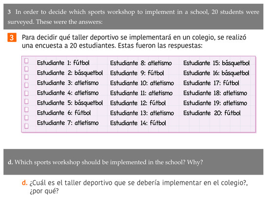 Few tasks fall into the categories of Connection or Reflection: the task in Figure 11 shows an example of a Connection task, in which the student is asked to inquire about strategies to rescue the Rapanui language, so that he/she connects the statistical graph with the extinction of a language. The task in Figure 12, on the other hand, requires the student to make a decision about the sports workshop that the school should offer, using the tools that he/she knows, so it is considered cognitively demanding Reflection.
