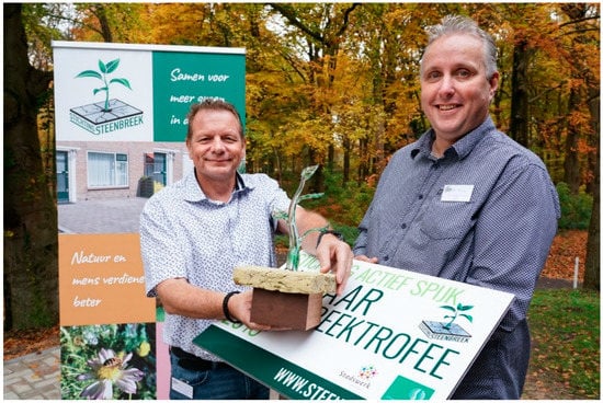 A special project is the yearly ‘Steenbreek trophy’. This incentive has been awarded since 2016 (2016 The Hague; 2017 Leeuwarden; 2018 Laarbeek; 2019 Foundation Active Spijk—municipality Zevenaar). It is an internal contest in which connected municipalities or villages compete over who has created the most greening impact that year. The city of The Hague was the first to win this trophy, many tiles in private gardens were replaced with vegetation. Last year’s winner was the Foundation Active Spijk, in which the village community had made enormous progress in greening gardens (Figure 1).
